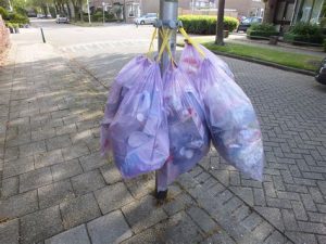 Veel mensen zitten met die ‘zak’ in hun maag… en hangen deze door de hele week heen gewoon op aan de daarvoor bestemde haak aan lantaarnpalen. Een lelijk gezicht maar doordat ze ook nog eens regelmatig kapot gaan (vogels die eraan krabbelen of pikken…) ligt de straat soms vol met rommel.